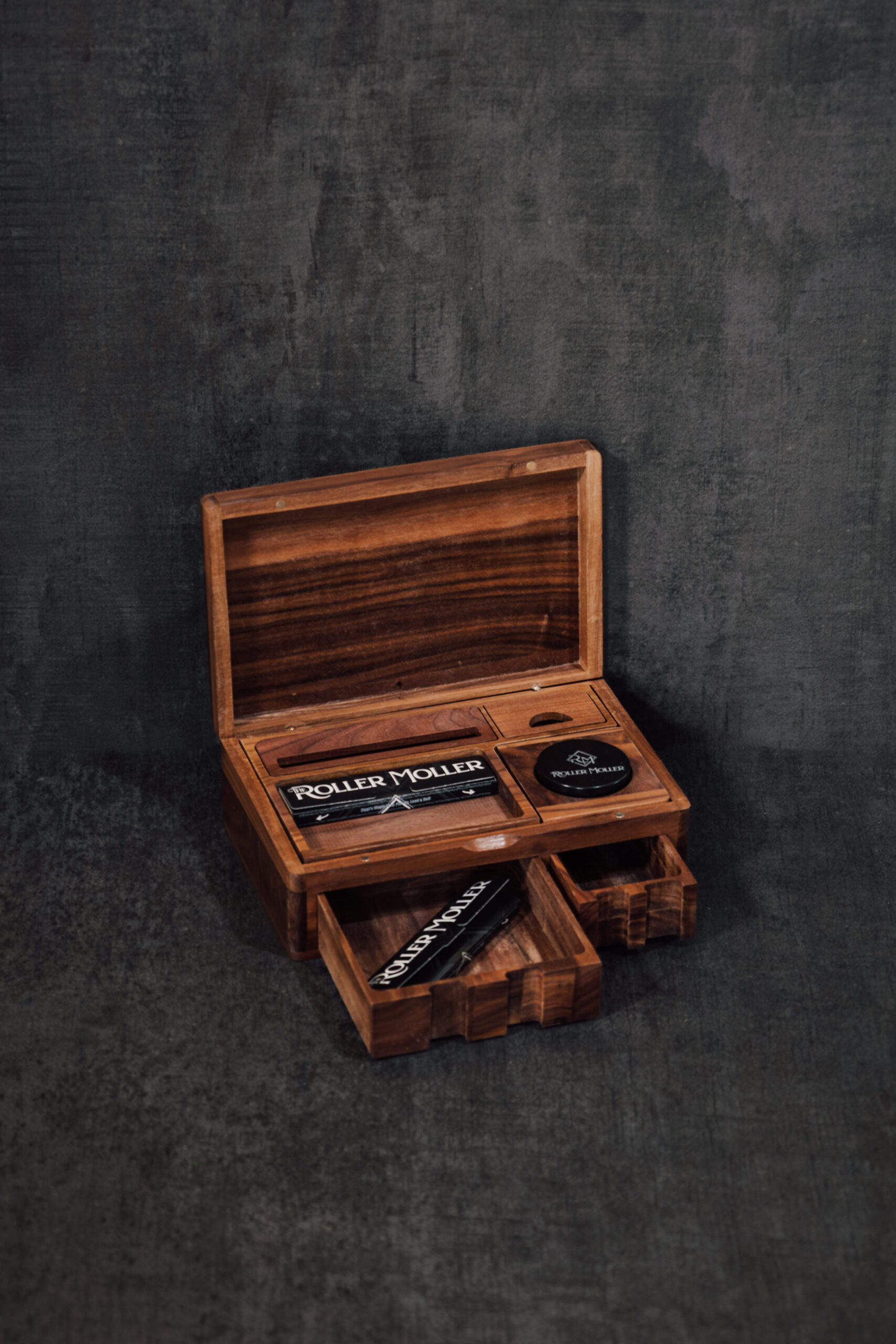 Eleganten in kompakten komplet The Roller Moller – Compact Edition združuje vse pripomočke za zvijanje v eni leseni škatli. Vgrajen pladenj, ločeni predali, mlinček in premium Snail Papers papirčki – popolno za doma ali na poti.